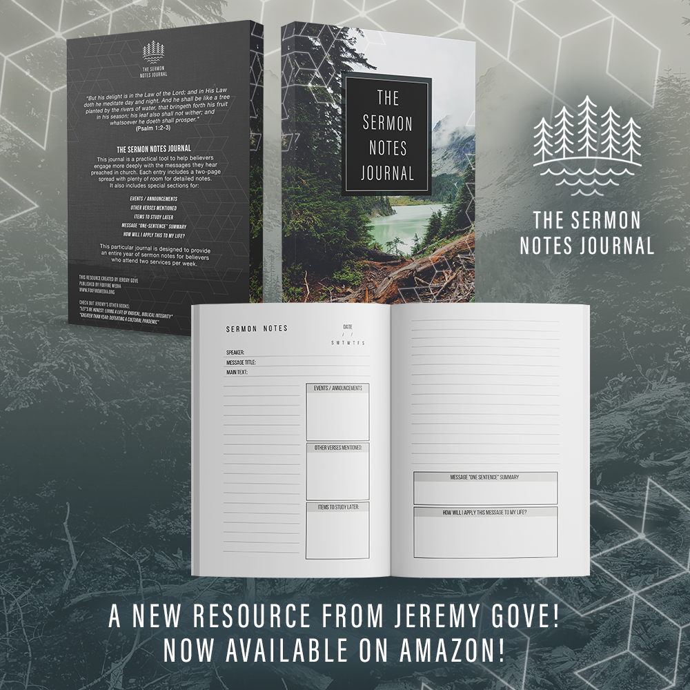The Sermon Notes Journal is a practical tool to help believers engage more deeply with the messages they hear preached in church. Each entry includes a two-page spread with plenty of room for detailed notes. It also includes special sections for "Events/Announcements," "Other Verses Mentioned," "Items to Study Later," "Message One-Sentence Summary," and "How Will I Apply This to My Life?" This particular journal is designed to provide an entire year of sermon notes for believers who attend two services per week.
